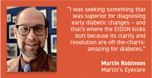 “I was seeking something that was superior for diagnosing early diabetic changes – and that’s where the EIDON kicks butt because its clarity and resolution are off-the-charts-amazing for diabetes,” Robinson says.