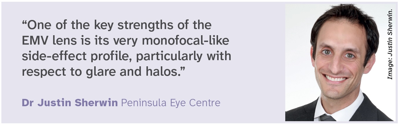 “One of the key strengths of the EMV lens is its very monofocal-like side-effect profile, particularly with respect to glare and halos,” he says.